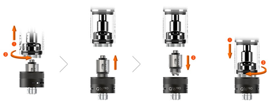 L'atomiseur Q16Pro dispose d'une contenance de 1.9ml, il présente un flux d’air ajustable et s'utilise avec les résistances JustFog de 1,2Ω ou 1,6Ω en Ni-Cr avec du coton 100% biologique. Le changement de résistance est classique et le remplissage se fait tout simplement par le haut.