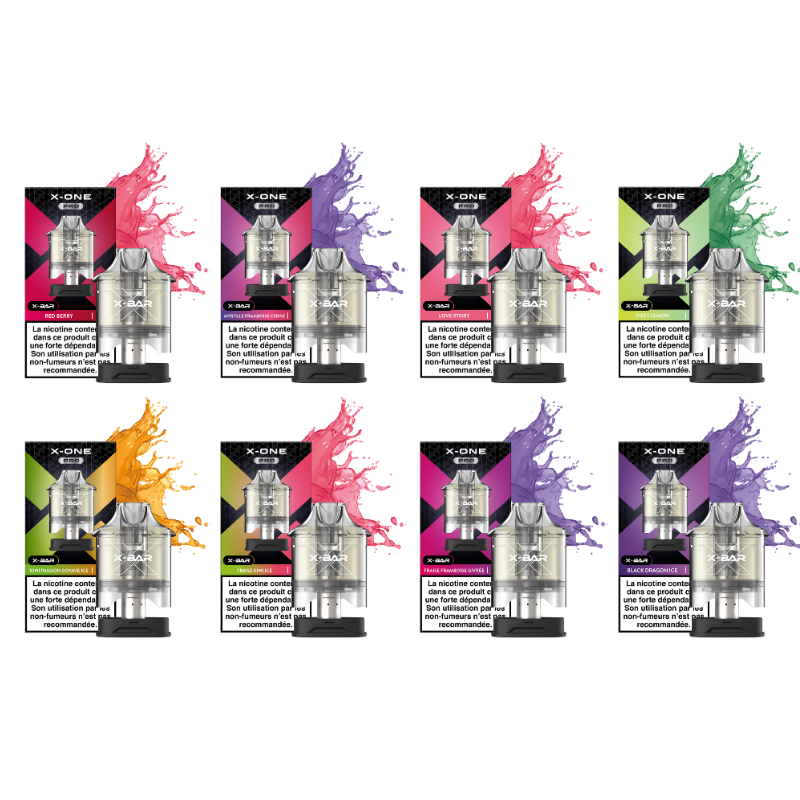 Cartouche X-One Pro d’une contenance de 10 ml avec 2 ml d'e‑liquide, dosée à 20 mg de sels de nicotine, compatible avec le kit X-One Pro de X-Bar.