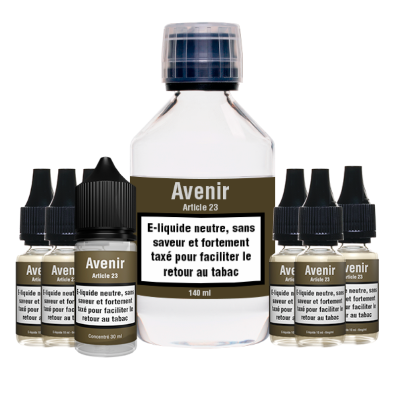 Vous souhaitez complètement tourner la page du e-liquide ou du concentré accessible à tous ? Avec la gamme Avenir, c'est enfin possible ! Vous souhaitez également arrêter de fumer ? Ça tombe bien, on ne pourra pas vous aider !