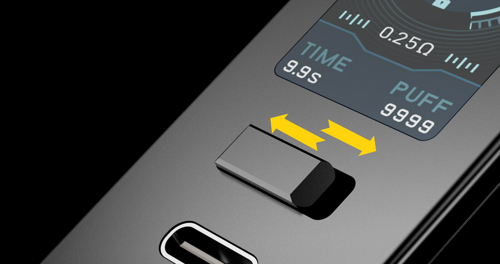 Ensuite, un écran couleur de 0,96" est présent sur la même face. Il donne plusieurs informations : la puissance, la valeur de la résistance, le niveau de charge de chaque accu, la durée et le nombre de bouffées. 2 modes d'écran sont disponibles : un mode normal et un mode RDA DIY si vous associez cette box à un atomiseur reconstructible.