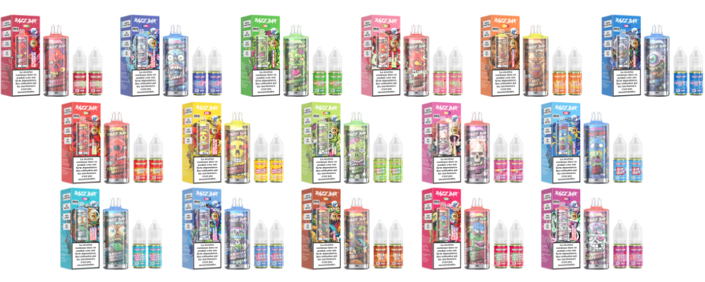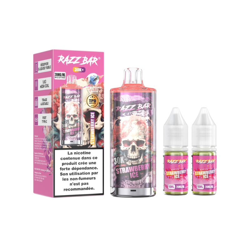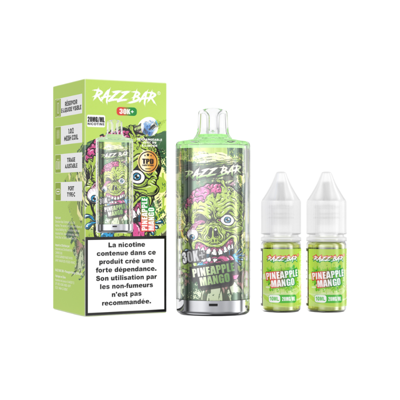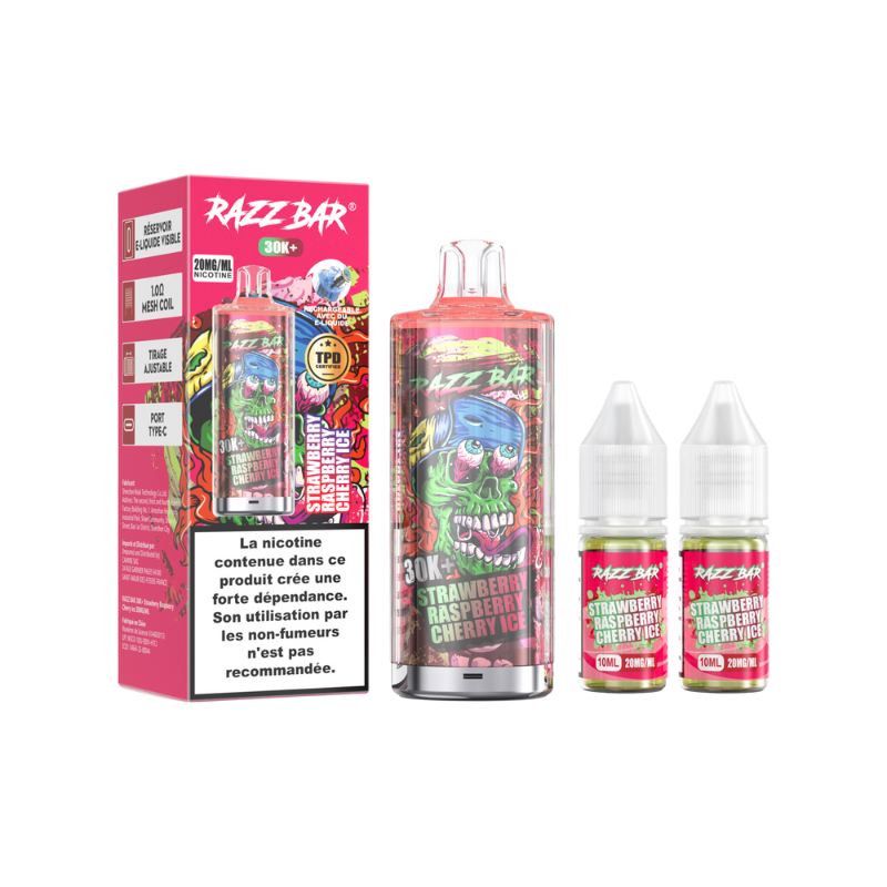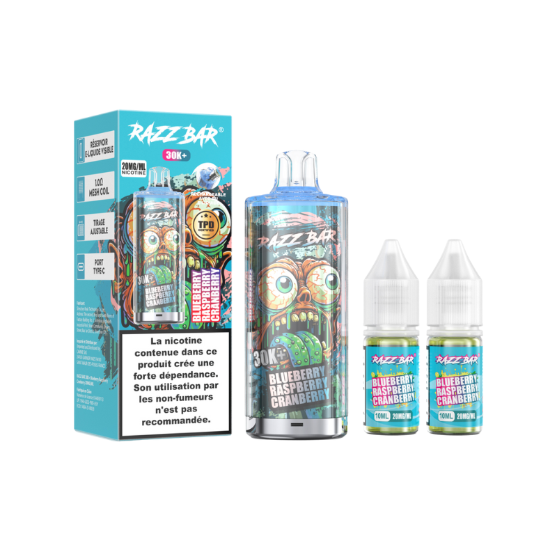 Le kit RazzBar 30K est un dispositif rechargeable qui peut aller jusqu'à 30 000 bouffées au maximum. Il contient une batterie intégrée de 650mAh et un réservoir pré-rempli de 2ml livré avec deux flacons de recharge d'une contenance de 10ml à 20mg de sels de nicotine.