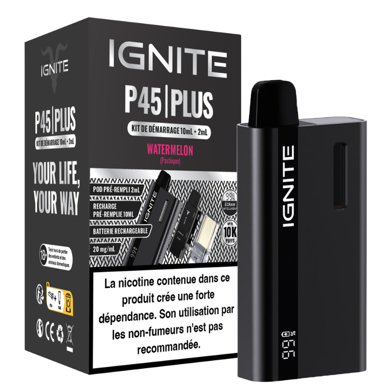 Le kit P45 Plus est un dispositif rechargeable avec du e-liquide prérempli conçu pour une vape MTL. Il dispose d’une capacité totale de 12ml d’e-liquide en 20mg de sels de nicotine, permettant jusqu’à 10 000 bouffées, et fonctionne avec une batterie rechargeable de 850 mAh. Il est équipé d’un écran LED et utilise des cartouches préremplies remplaçables.