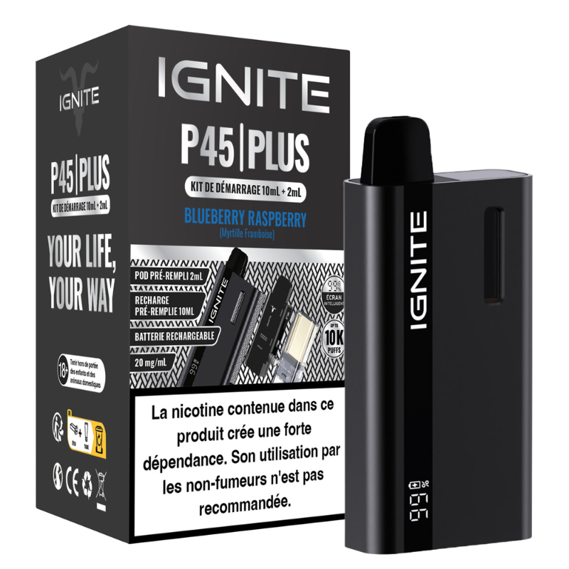 Le kit P45 Plus est un dispositif rechargeable avec du e-liquide prérempli conçu pour une vape MTL. Il dispose d’une capacité totale de 12ml d’e-liquide en 20mg de sels de nicotine, permettant jusqu’à 15 000 bouffées, et fonctionne avec une batterie rechargeable de 850 mAh. Il est équipé d’un écran LED et utilise des cartouches préremplies remplaçables.