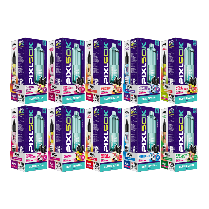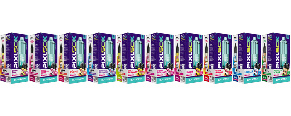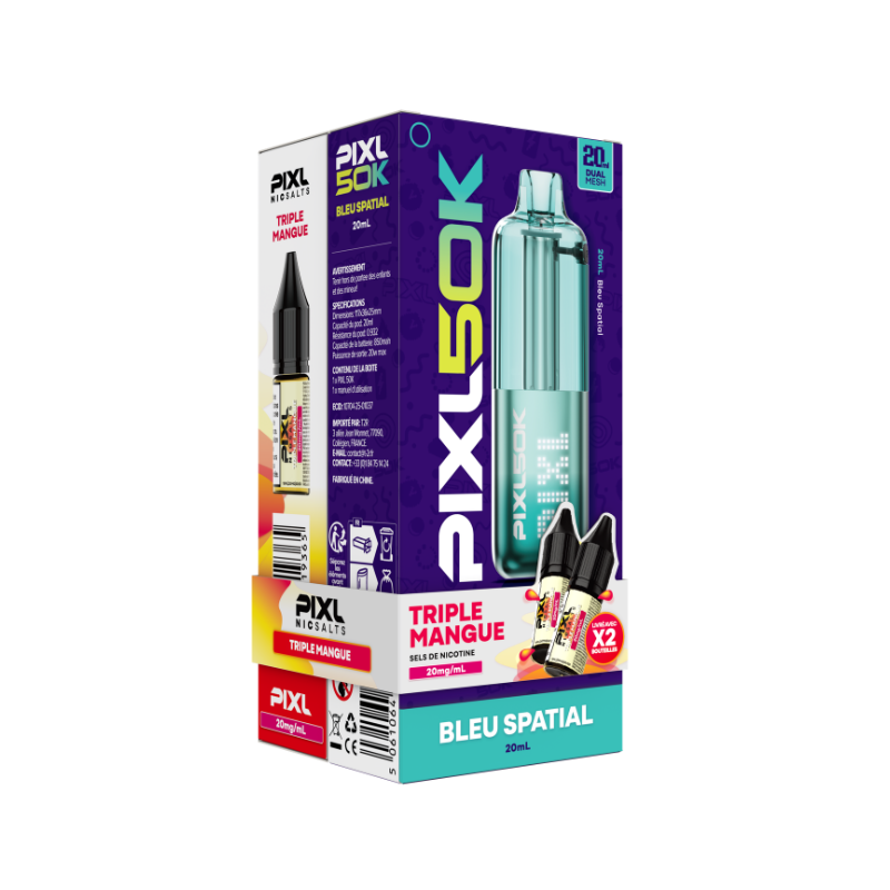 Le kit PIXL 50K est un dispositif rechargeable avec une batterie de 850 mAh. Il utilise des cartouches préremplies totalisant 20 ml d’e-liquide (2 x 10 ml) en 20mg sels de nicotine et peut atteindre jusqu’à 50 000 bouffées.