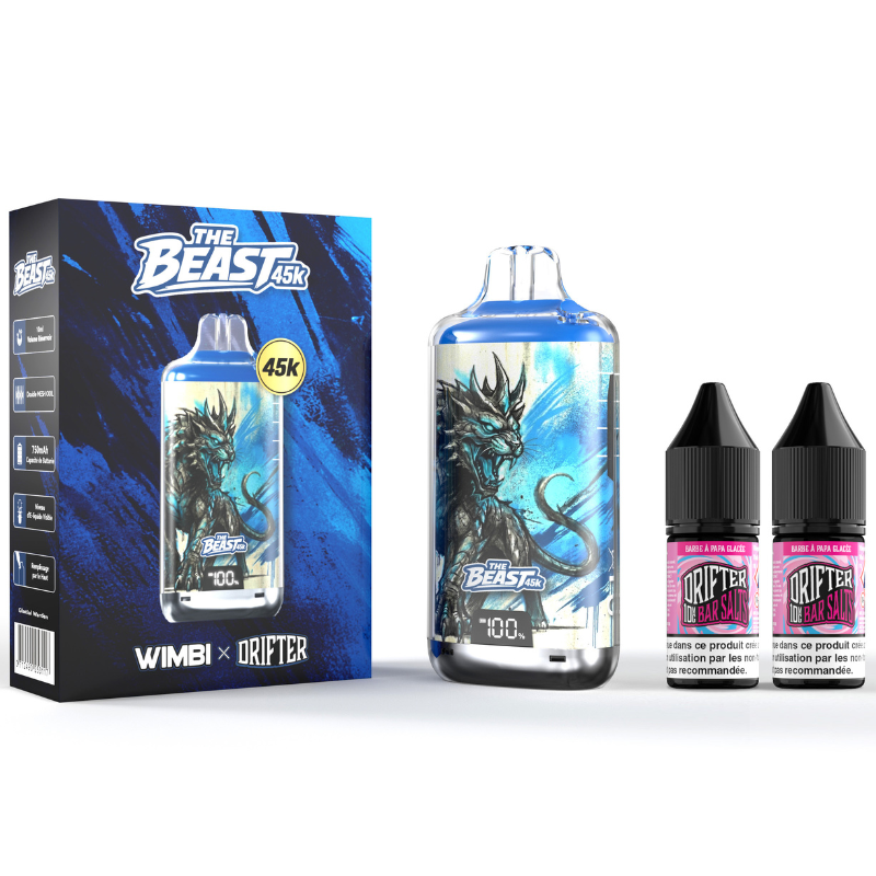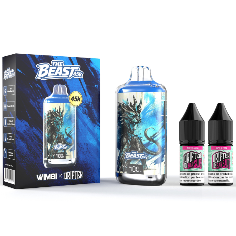 Le kit The Beast 45K Glacial Warden Wimbi X Drifter est un pod rechargeable de 750 mAh, fourni avec 2 flacons d’e-liquide Drifter de 10 ml (20 ml au total) en sels de nicotine 20 mg, avec un fonctionnement pouvant atteindre 45 000 bouffées.