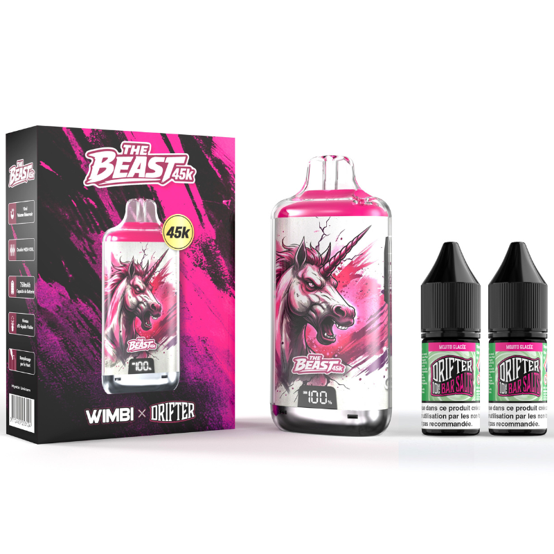 Le kit The Beast 45K Mystic Unicorn associe une batterie de 750 mAh à 2 e-liquides Drifter de 10 ml (20 ml total) en sels de nicotine 20 mg, pour une capacité allant jusqu’à 45 000 bouffées.