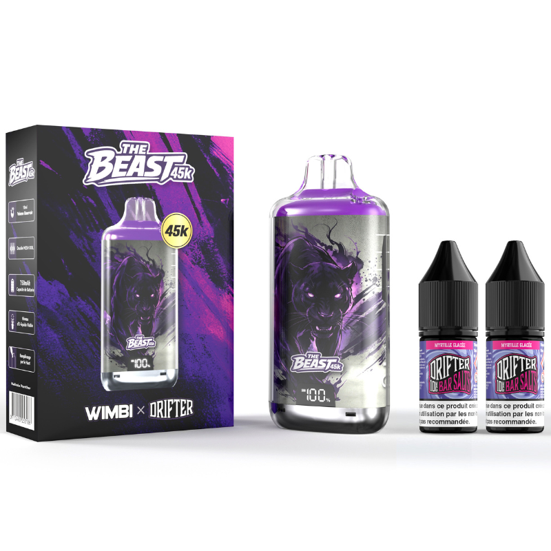 Le kit Nebula Panther The Beast 45K comprend une batterie 750 mAh, deux e-liquides Drifter 10 ml (20 ml total) en sels de nicotine 20 mg, et permet jusqu’à 45 000 bouffées.