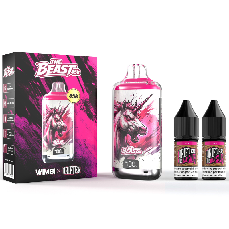 Le kit Mystic Unicorn The Beast 45K dispose d’une batterie 750 mAh, accompagné de deux e-liquides Drifter 10 ml (20 ml total) en 10 mg sels de nicotine, pour jusqu’à 45 000 bouffées.