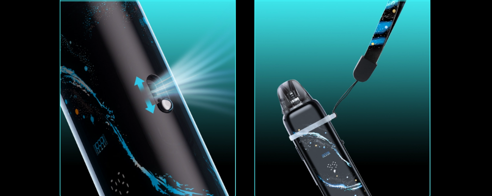 Le kit inclut également une lanière permettant de transporter le pod et dispose d'un airflow réglable sur le côté.