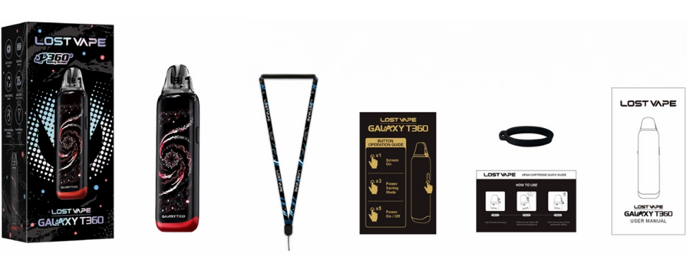 Le kit Galaxy T360 de Lost Vape est un pod mod compact avec batterie intégrée de 1200mAh et puissance maximale de 35W. Il utilise des cartouches URSA V3 de 2,5 ml avec remplissage par le haut et airflow réglable.