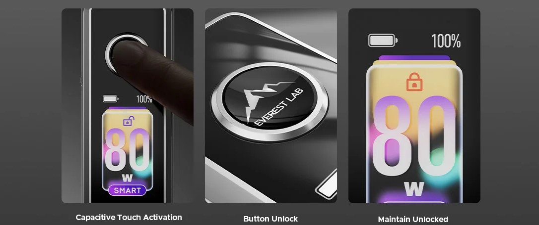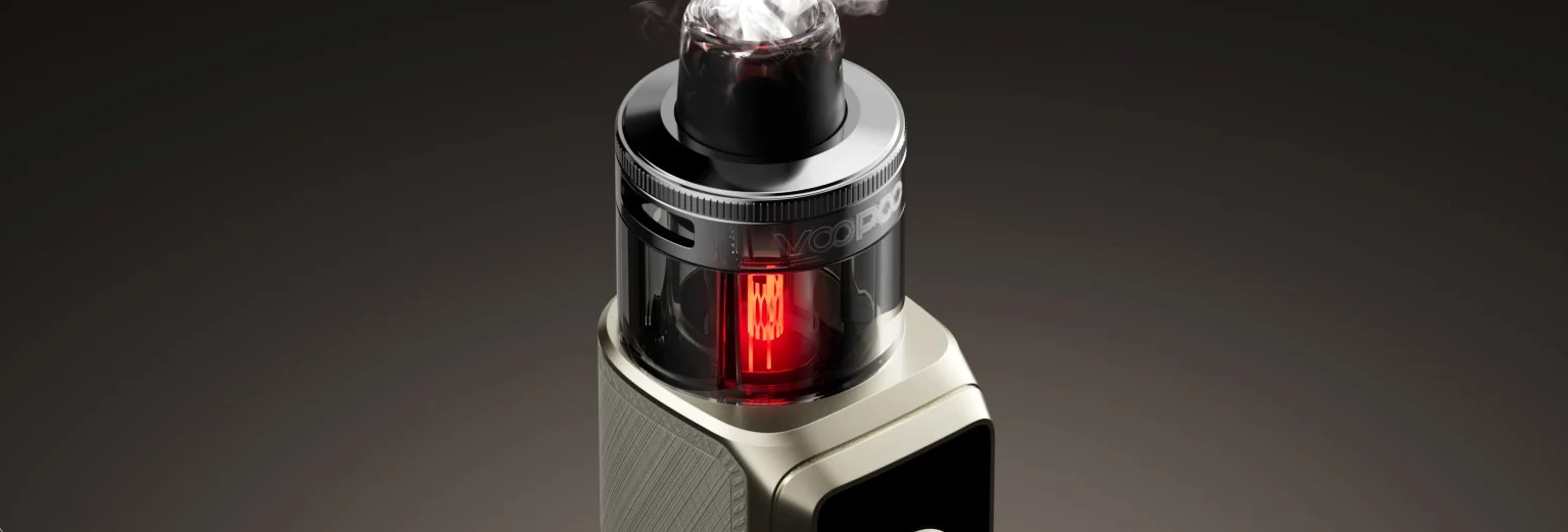 L'écran TFT couleur de 1,66" affiche la puissance, l'autonomie restante, le mode sélectionné et le nombre de bouffées, avec la possibilité de choisir différents thèmes. Le kit intègre également six protections, dont une contre les inhalations dépassant 8 secondes.