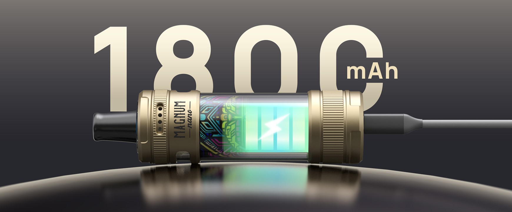 Le kit Magnum Nano d’Aspire intègre une batterie de 1800mAh rechargeable via un câble USB Type-C (fourni). Il utilise un système auto-draw pour activer la vape par inhalation et ajuste automatiquement la puissance selon la résistance installée. Le chipset ASP fournit six protections, dont une contre les inhalations supérieures à six secondes.