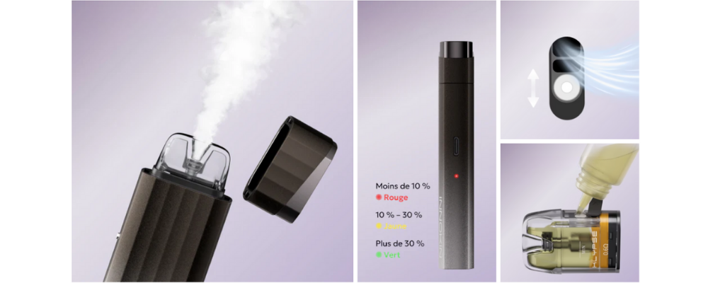 L’activation se fait à l’inhalation et un indicateur lumineux signale le niveau de charge. L’airflow est réglable sur le côté pour moduler le tirage. Un capuchon magnétique maintient la cartouche en place sur le pod.