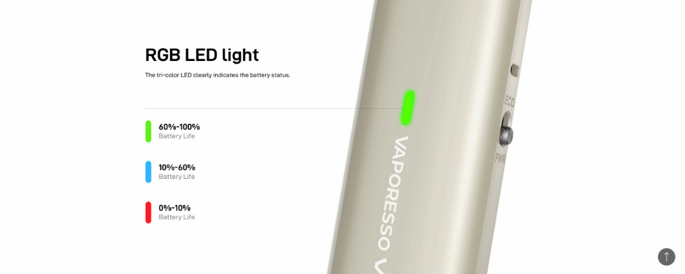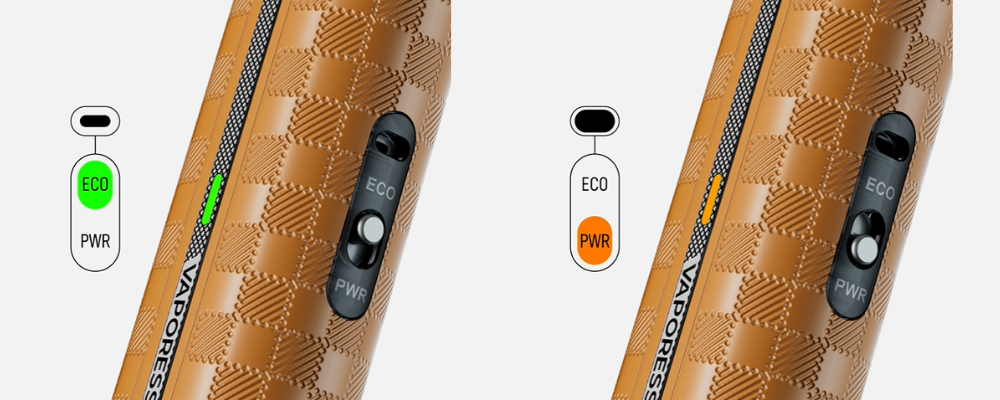 Un glissement du bouton permet de changer de mode et de régler le flux d’air. La batterie ajuste automatiquement la puissance selon la cartouche et indique la batterie via une LED. Le pod propose un fonctionnement par inhalation avec une puissance maximale de 30W, réglable via les modes PWR et Éco sélectionnables par un interrupteur latéral.