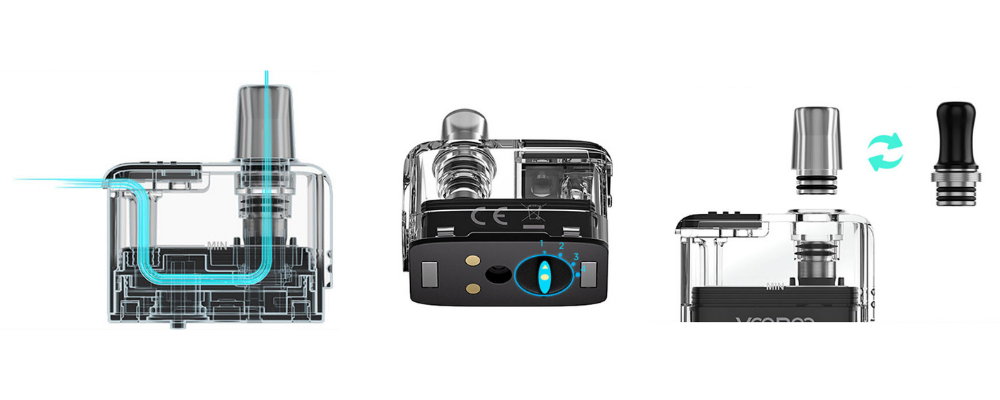 Le pod dispose d’un airflow réglable sur plusieurs niveaux, permettant d’ajuster l’entrée d’air selon le style de tirage souhaité. Les informations essentielles telles que le niveau de batterie, la puissance réglée et la valeur de la résistance sont affichées sur l'écran.